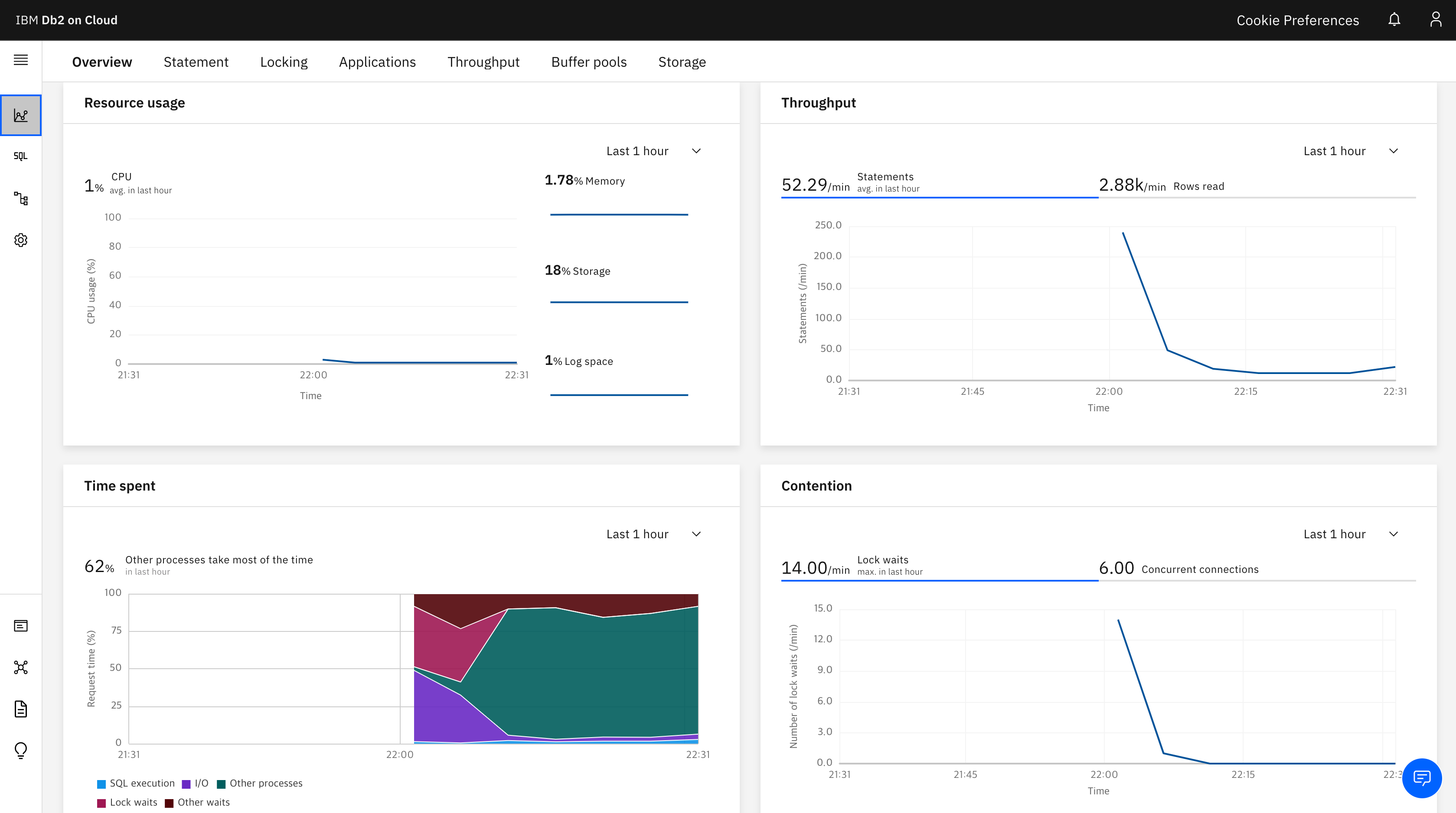 DB2 Dashboard입니다. DB2의 현재 상태에 대해서 나타냅니다. 수행중인 명령문, Lock 상황, 어플리케이션 수행 사항, 버퍼풀 스토리지등에 대한 성능을 모니터링 할 수 있습니다.