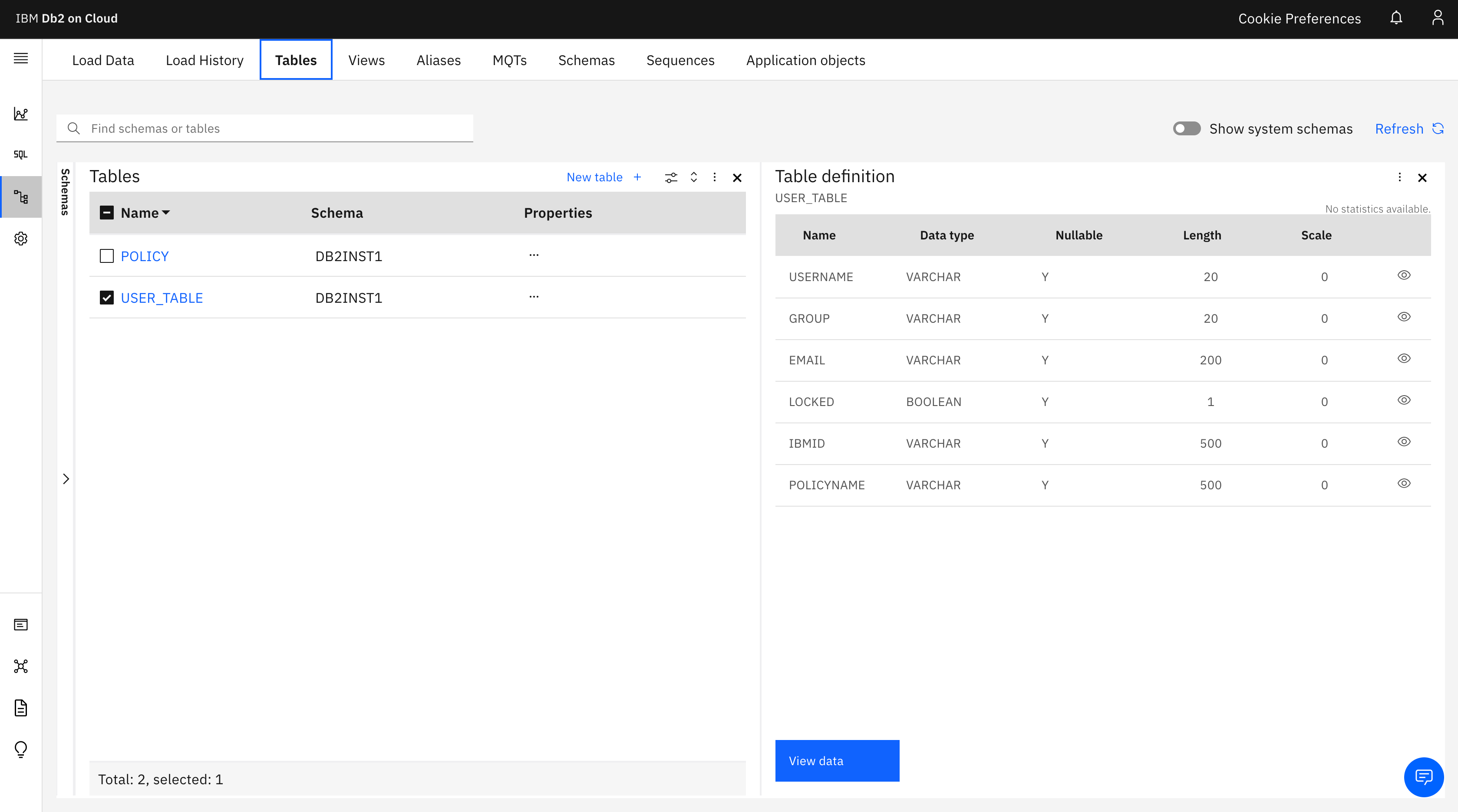 데이터를 적재하고 적재한 데이터에 대한 테이블 상황을 볼수 있습니다. 뷰, 앨리어스, MQT등을 볼 수 있으며 테이블을 조회하여 테이블에 대한 데이터또한 확인이 가능합니다.