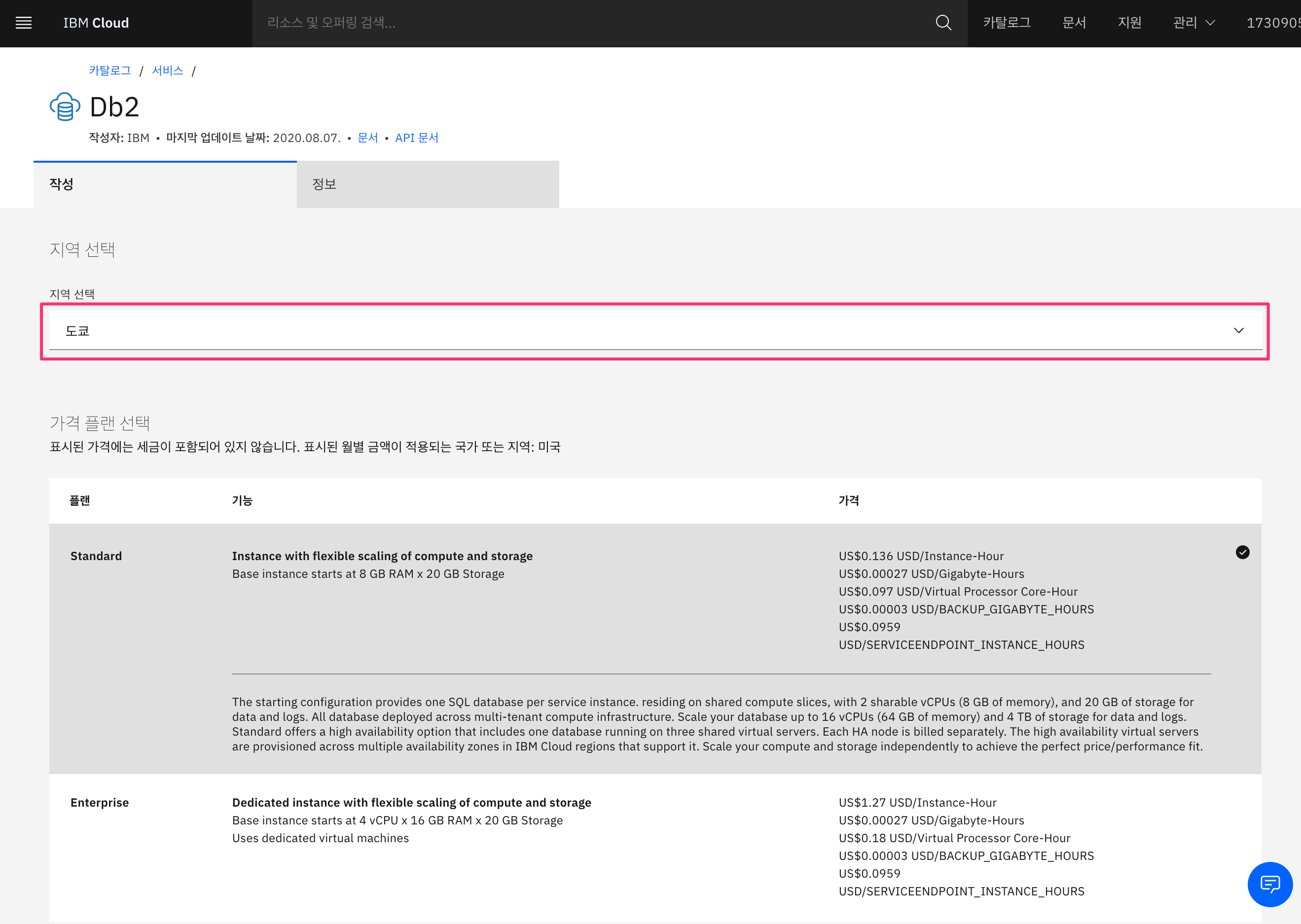 DB2를 선택하면 위와 같은 생성 화면이 나옵니다. 리전을 선택합니다. 우리나라와 가장 가까운 지역인 도쿄를 선택합니다.