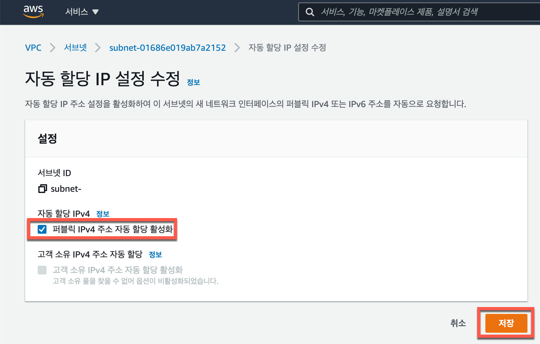 '퍼블릭 IPv4주소 자동할당 활성화'를 체크하고 아래 저장을 누릅니다.
