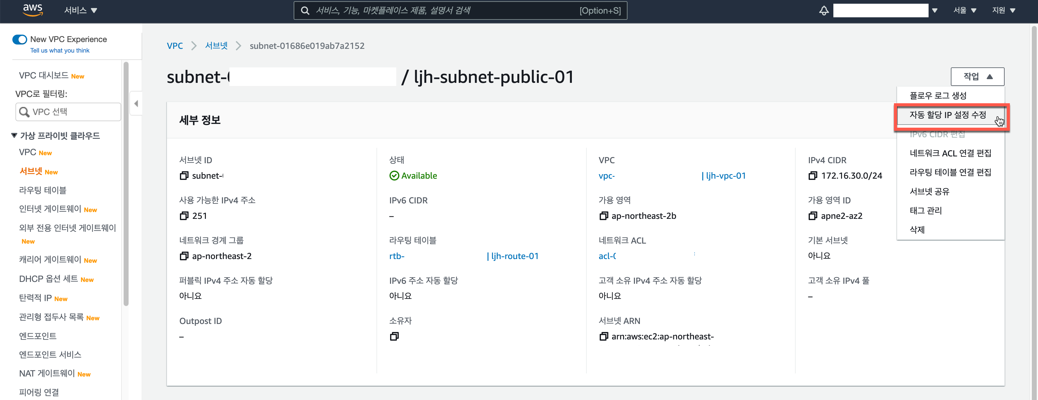 public 01을 선택하면 아래처럼 상세 화면이 나옵니다. 오른쪽 위에 작업 버튼을 누르고 '자동 할당 IP설정 수정' 을 클릭합니다.