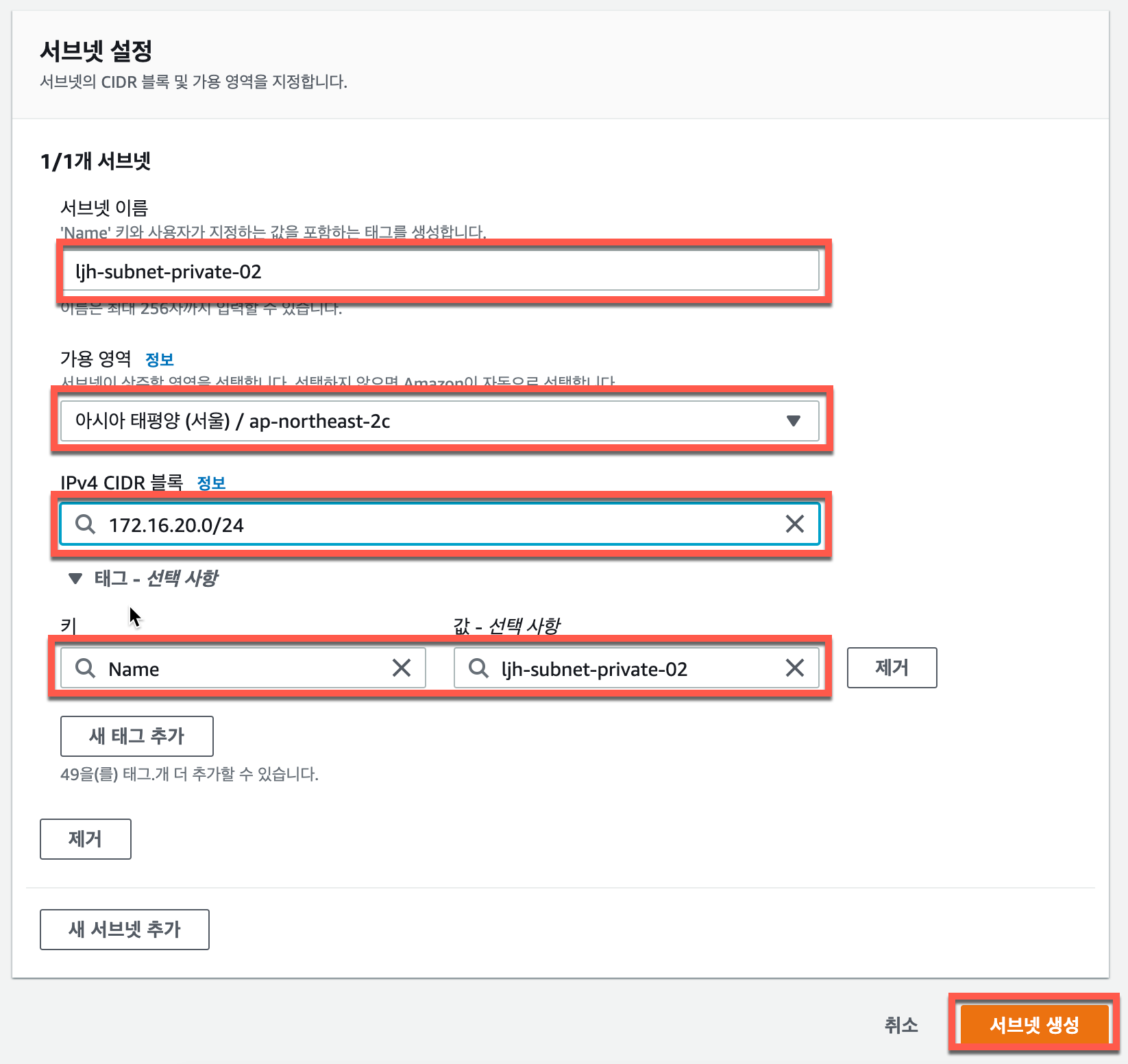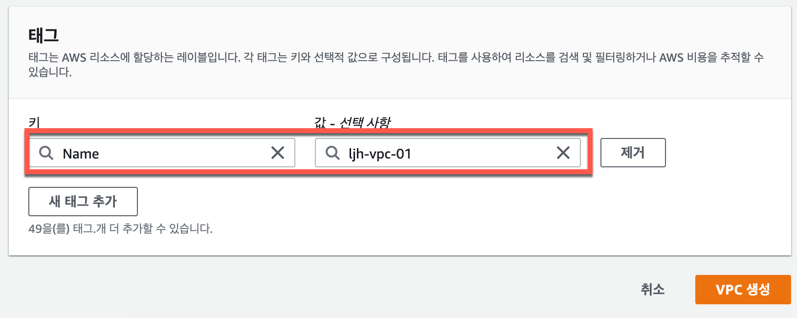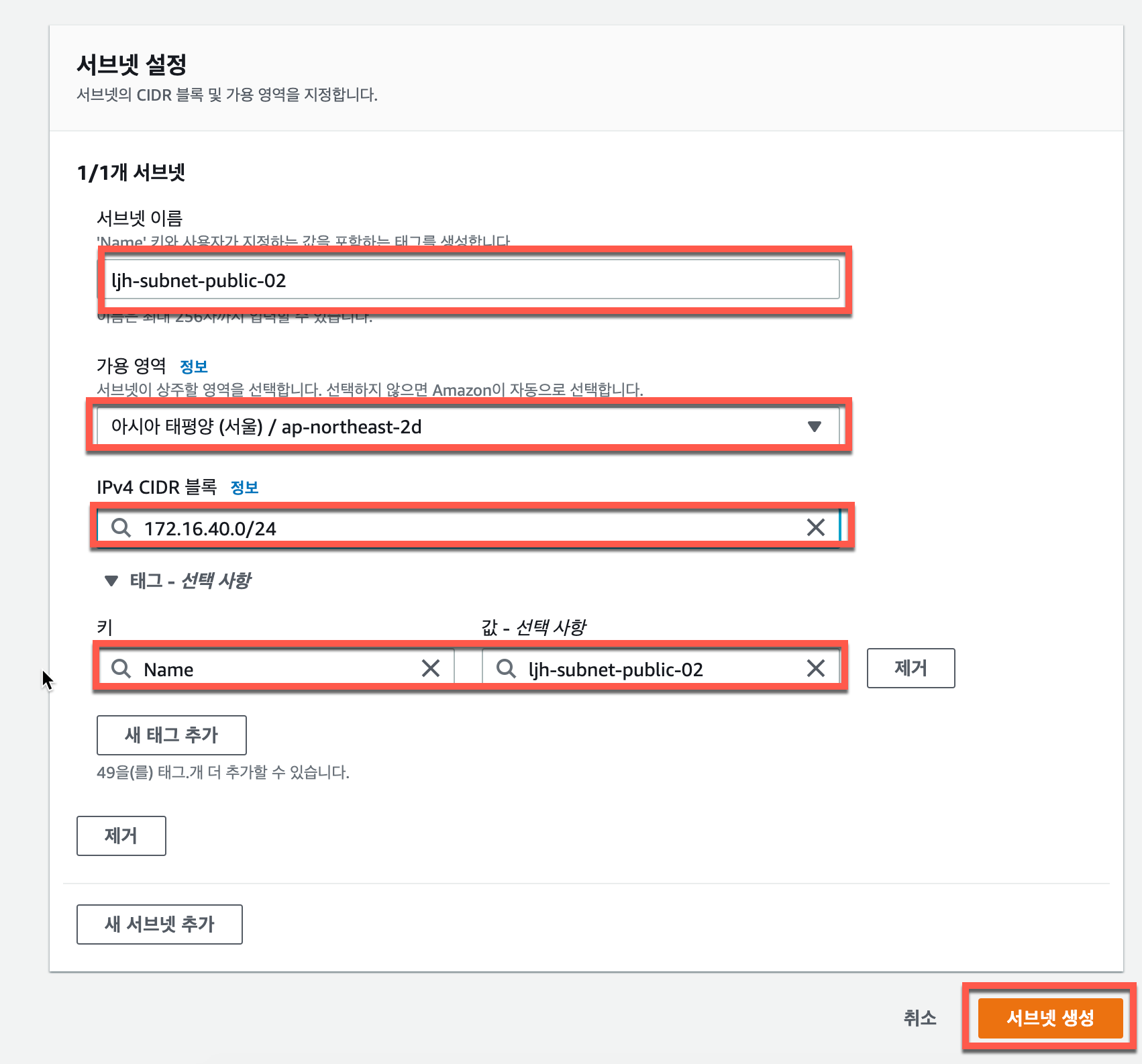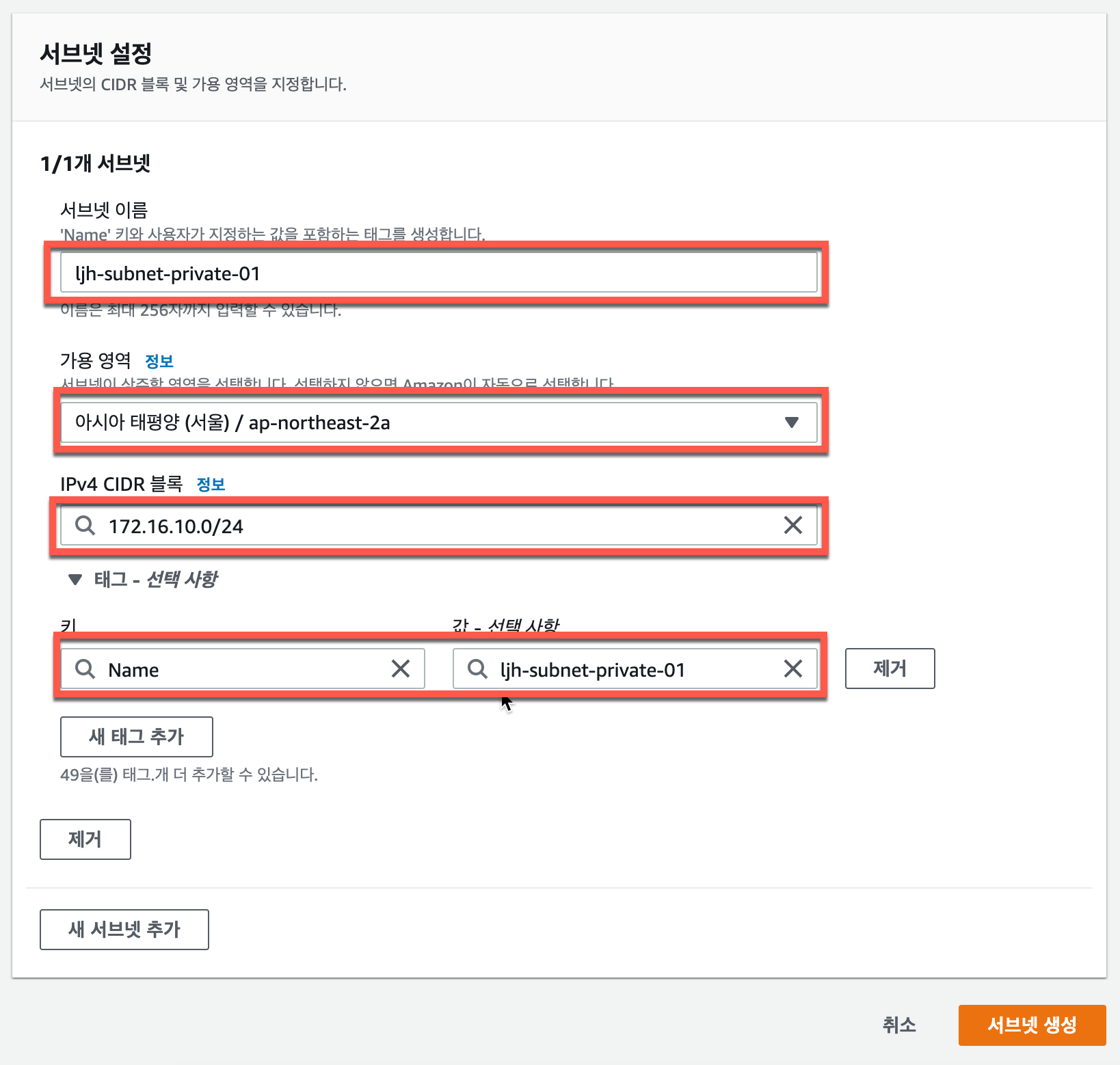 키 및 값 : 위에서 서브넷 이름을 입력하면 자동으로 입력됩니다.