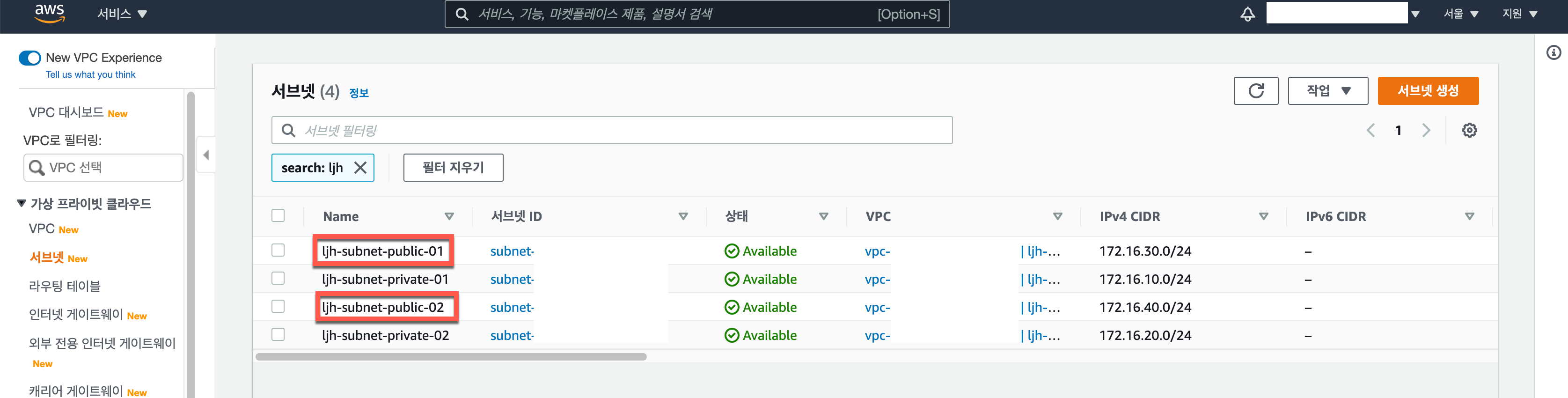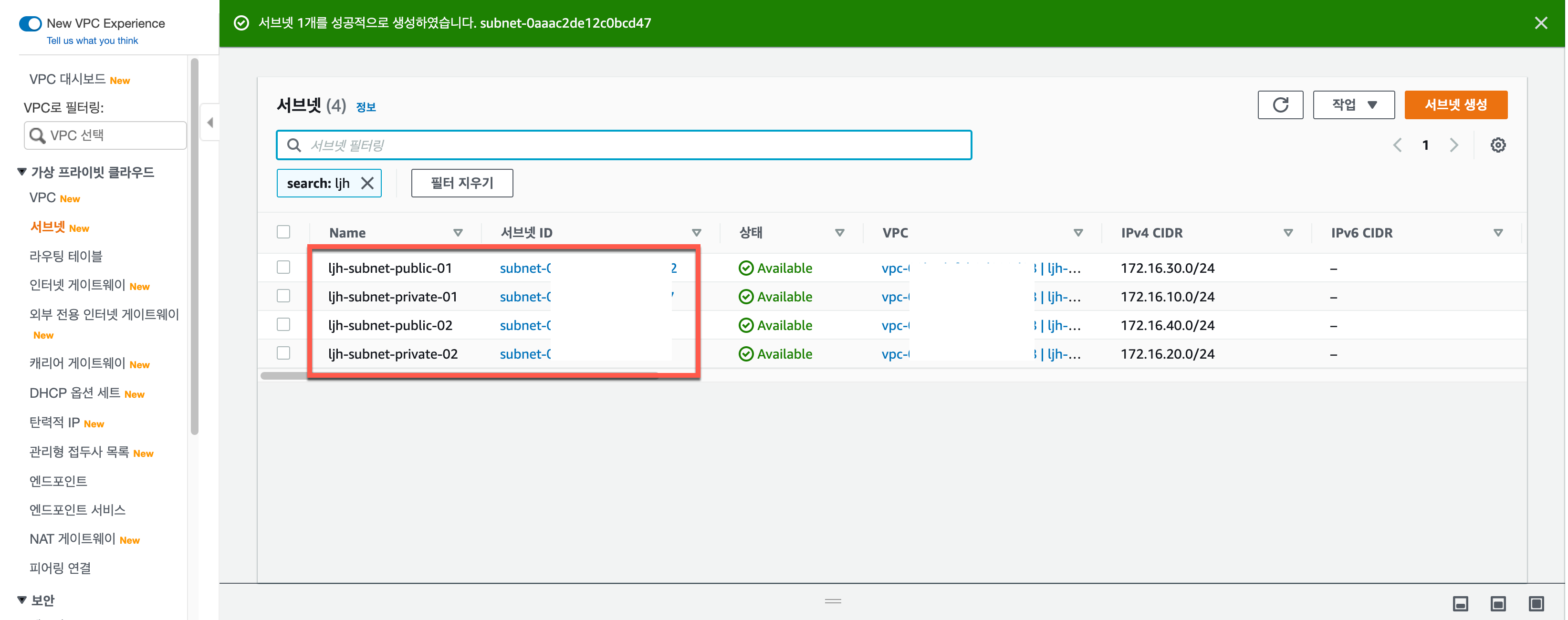 서브넷이 생성된것을 확인합니다. 추가로 서브넷을 생성합니다.
