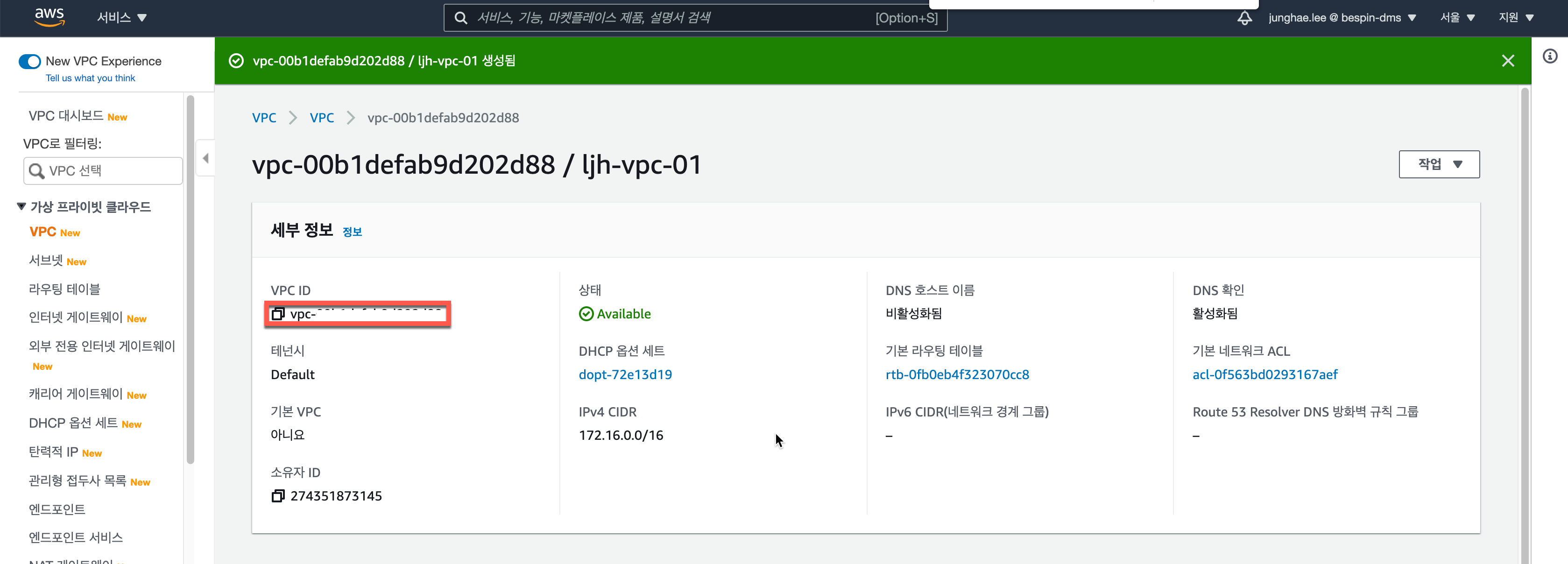 위에서 생성한 VPC ID를 찾습니다. 앞에 VPC이름명을 검색하면 바로 검색이 됩니다.