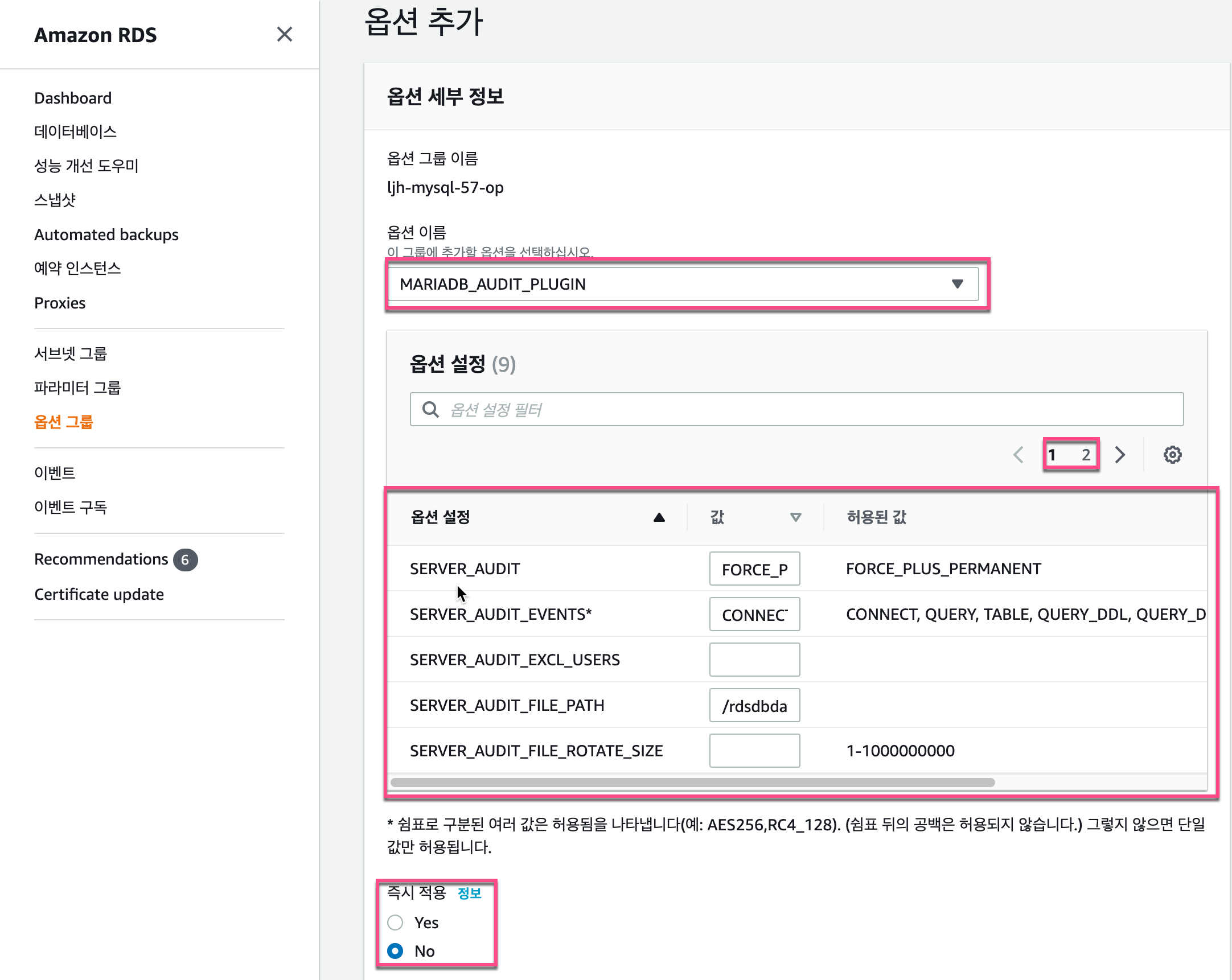 옵션그룹을 생성합니다. 옵션은 보안과 관련된 설정합니다. 참고로 엔진별로 옵션그룹의 내용은 다릅니다.