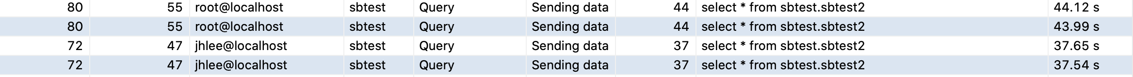 show processlist로도 확인이 간으하나 sys.session으로 보시면 좀더 정확한 모니터링이 가능합니다.