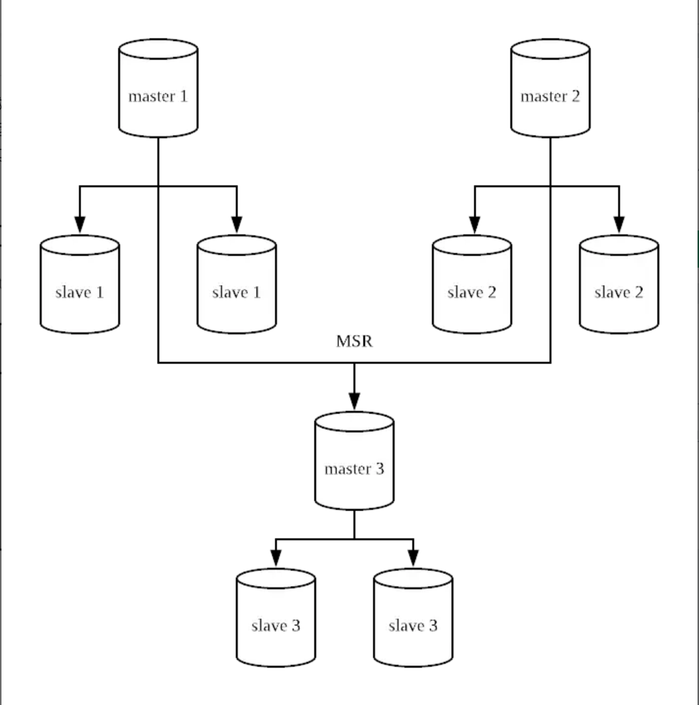 이 방식을 이용하면 여러 마스터 서버의 특정 DB만을 슬레이브에서 받아서 한번에 조회가 가능하다는 장점이 있습니다. 예를 들어 MASTER 1번의 특정 DB, MASTER 2번의 특정 DB, MASTER 3은 전체 DB를 복제하여 이 DB들을 한곳에 모아서 조회를 할수가 있습니다. 이것을 응용한다면 아래와 같은 그림으로도 구성할 수 있습니다.