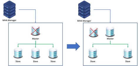 위의 그림에서 MHA Manager는 N개의 복제그룹을 모니터링 합니다. 모니터링중 특정 복제그룹에서마스터에 문제 발생시 슬레이브들중 하나를 마스터로 승격시키고 나머지 슬레이브들을 신규 마스터로승격된 서버로 붙게 됩니다. 이렇게 함으로써 지속적인 서비스가 가능하도록 합니다.