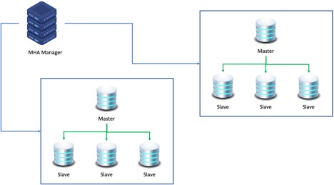 MHA는 MHA 매니저와 MHA 노드로 구성되어 있습니다. MHA 매니저는 마스터 서버를 모니터링 하며이상 유무를 판단하고 MHA노드는 각 서버들의 바이너리 로그를 확인하는 역활로 쓰입니다. 또한MHA서버는 여러 마스터-슬레이브로 구성된 복제 그룹 여러개를 모니터링 할 수 있습니다.