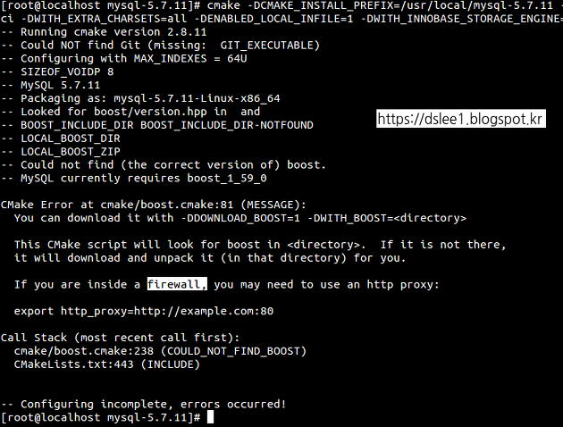 mysql 5.7.x 설치시 boost 라이브러리를 참조하기 때문에 이부분을 컴파일 과정에서 추가해줘야된다.