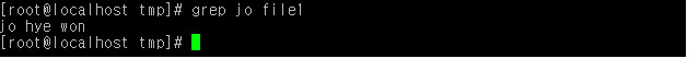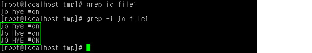 다음은 i 옵션을 사용하지 않은 예이다. file1에 들어있는 내용 중에 jo라는 문자열이 들어간 행을 찾은 결과, 한개의 행만 출력되었다.