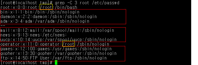 아래 그림을 보면 root라는 문자열이 들어간 라인 행에서 아래의 2개 라인의 내용을 더 보여주는 것을 확인할 수 있다.