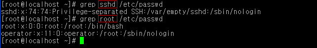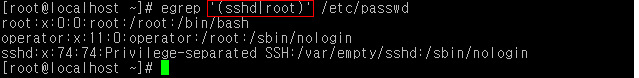 /etc/passwd 파일의 내용 중 sshd와 root라는 특정 패턴을 찾기 위해 따로 검색하여 출력하였다.