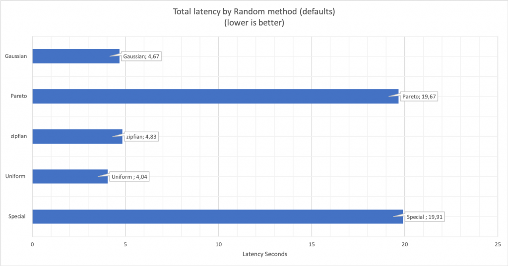 기본적으로 sysbench에는 난수를 생성하는 5가지 방법이 있습니다. 그러나 종종(실제로 거의 항상) 명시적으로 정의된것은 없으며, 방법이 허용할 때 매개 변수화를 보는 경우는 거의 없습니다.