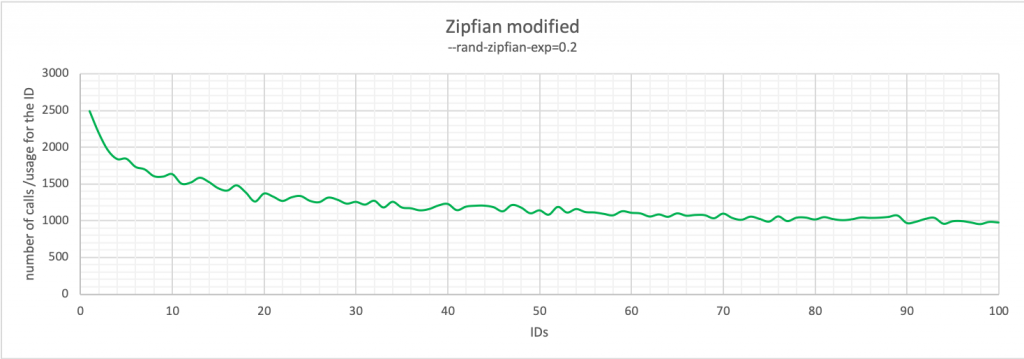 Zipfian도 조정할 수 있으며 파레토와 마찬가지로 반전을 얻을 수는 없지만 하나의 값을 똑같이 분산하여 시나리오를 쉽게 분산시킬 수 있습니다. 좋은 예는 다음과 같습니다.